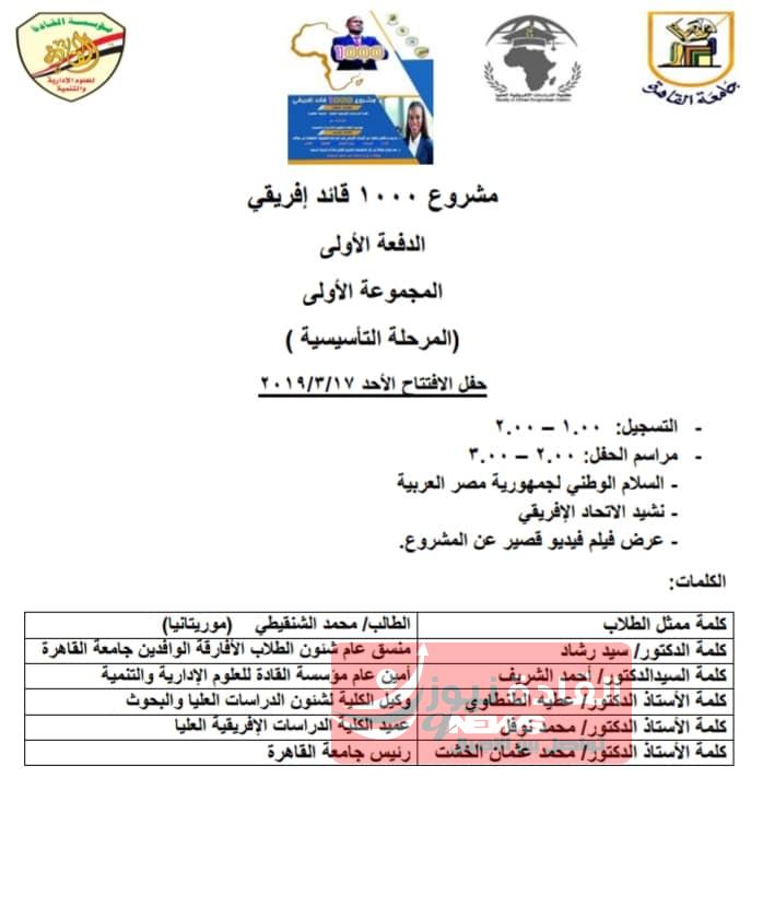 حيث تنطلق يوم الأحد القادم الموافق ١٧ مارس أولى فعاليات مشروع ١٠٠٠ قائد إفريقي الذي تنظمه كلية الدراسات الإفريقية العلياجامعة القاهرة بالشراكة مع مؤسسة القادة للعلوم الإدارية والتنمية؛ حيث من المقرر أن تبدأ المجموعة الأولى من الدفعةالأولى ( المرحلة التأسيسية) للمشروع والتي تضم ١٦٠ متدرب من مصر و٣٣ دولة إفريقية..