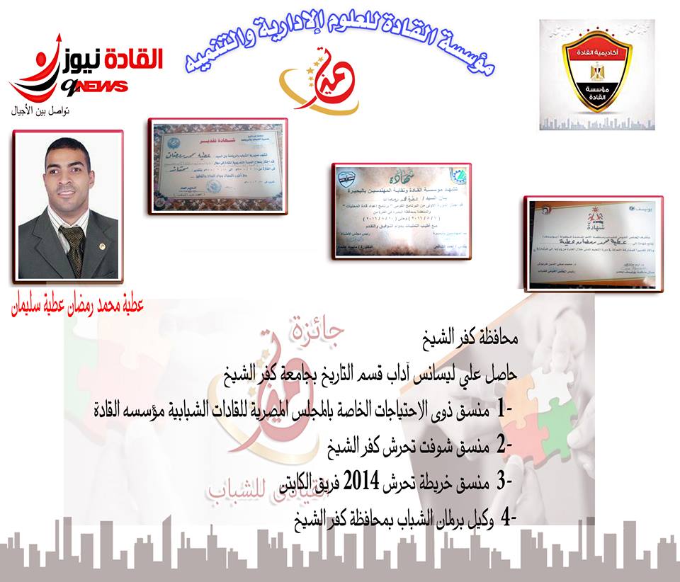 الاستاذ عطية محمد رمضان عطية سليمان وصل إلى المرحلة الثانية لجائزة التميز القيادي للشباب قسم الفرع اعضاء مؤسسة القادة منتظر دعم الأصدقاء للوصول إلى المرحلة النهائية للمسابقة الدعم بالتعليق على البوست فهي مرحلة التصويت الإليكتروني.
