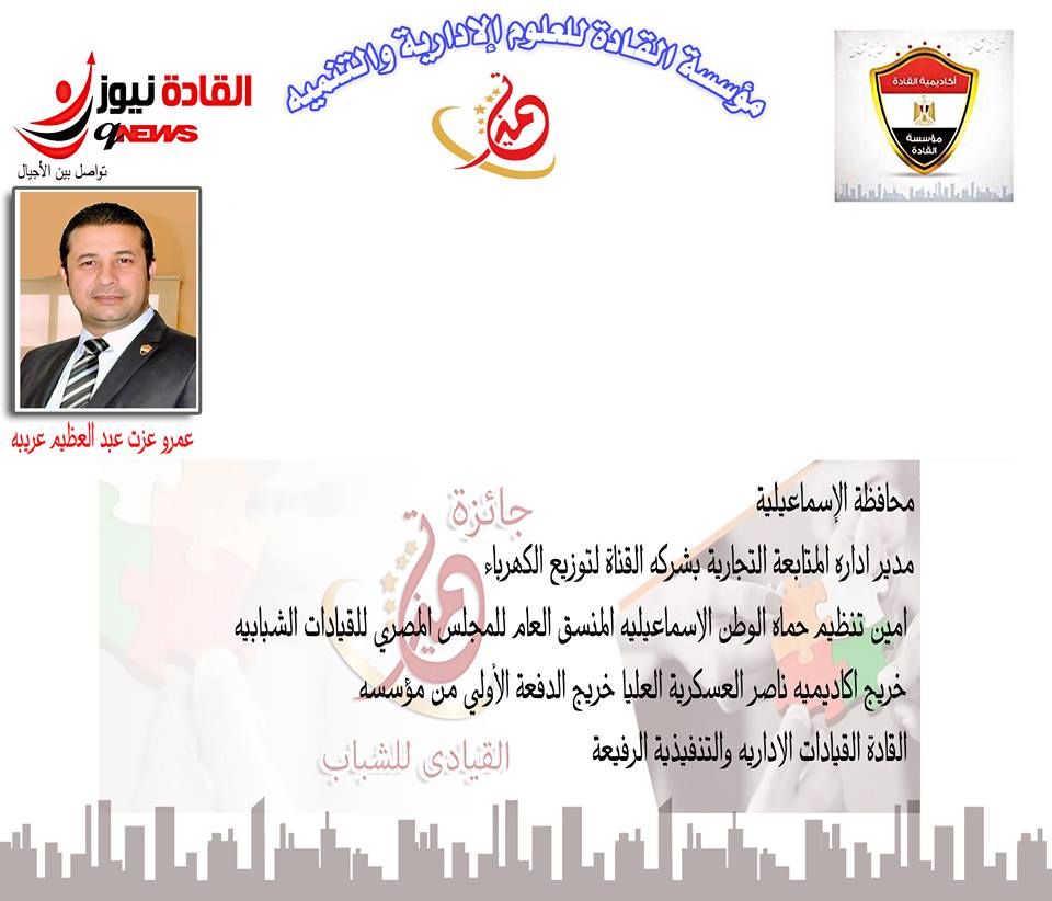 الاستاذ عمرو عزت عبد العظيم وصل إلى المرحلة الثانية لجائزة التميز القيادي للشباب قسم الفرع اعضاء مؤسسة القادة منتظر دعم الأصدقاء للوصول إلى المرحلة النهائية للمسابقة الدعم بالتعليق على البوست فهي مرحلة التصويت الإليكتروني.