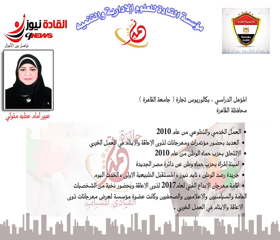 الاستاذة عبير امام عطيه متولي وصل إلى المرحلة الثانية لجائزة التميز القيادي للشباب قسم الفرع اعضاء مؤسسة القادة منتظر دعم الأصدقاء للوصول إلى المرحلة النهائية للمسابقة الدعم بالتعليق على البوست فهي مرحلة التصويت الإليكتروني.
