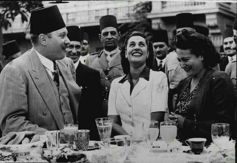 صورة نادرة للملك فاروق على إحدى موائد الطعام مع بعض الطالبات وفي الخلف يقف أحمد حسنين باشا رئيس الديوان الملكي و حيدر باشا وزير الحربية ..