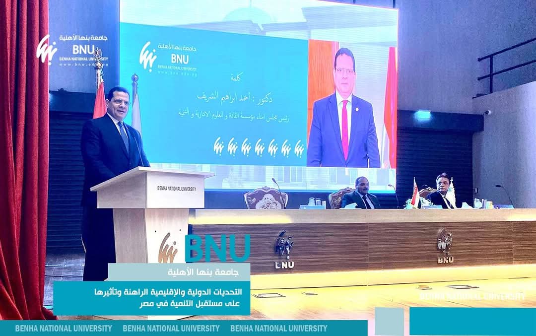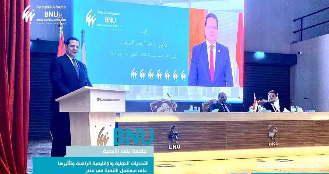 محاضرة هامة لدكتور / أحمد الشريف رئيس مجلس أمناء مؤسسة القادة للعلوم الادارية و التنمية في ندوة توعوية نظمتها جامعة بنها الأهلية بعنوان “التحديات الدولية والإقليمية الراهنة وتأثيرها على مستقبل التنمية في مصر”، أشار فبها أن مؤسسة القادة تسعى دائماً إلى دعم المبادرات التي تعزز من الوعي الوطني وتدعم التنمية المستدامة، مشيراً الي ضرورة المعرفة والوعي بما يدور من تحديات دولية وإقليمية ومدى تأثير علي التنمية ودور الدولة في مواجهة تلك التحديات و فتح آفاقًا أوسع للشباب للمشاركة الفعالة في قضايا وطنهم.