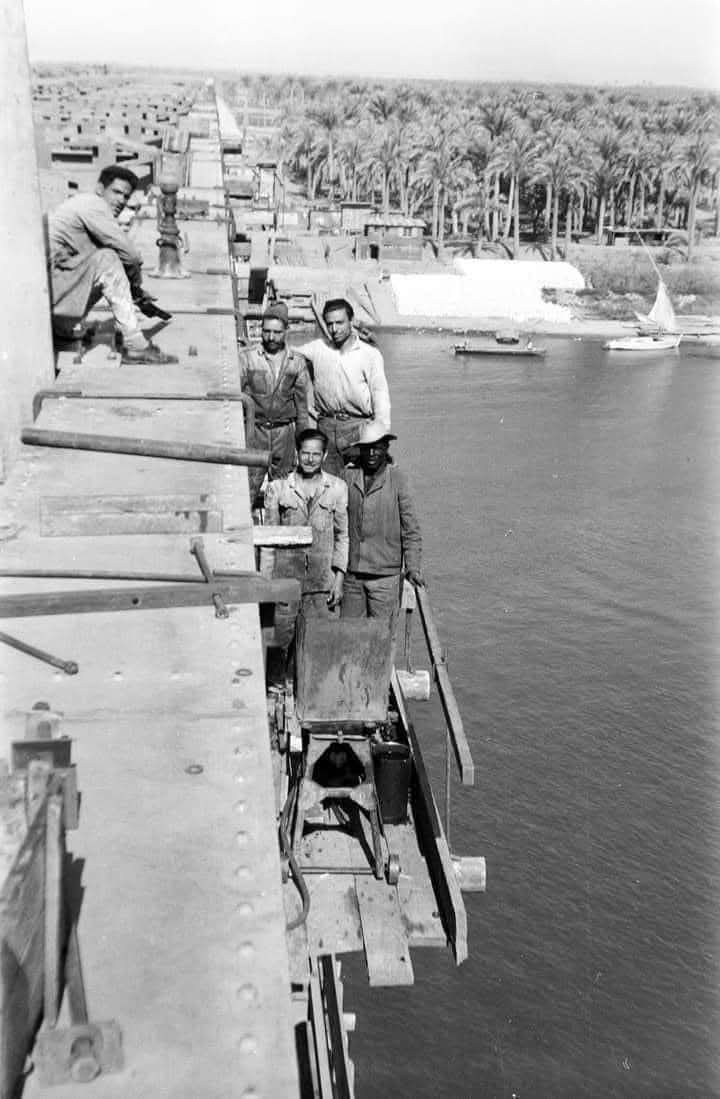 صور نادرة للعمال أثناء إنشاء أطـــول كوبري معدني في مصر علي ضفاف نهر النيل سنة «1955» إلي «1958» كـــوبـــري المرازيق الواصل من البدرشين الجيزة إلي حــلوان القاهرة هو من أطول الكباري المعدنية في مصر طوله حوالي 1000 متر…