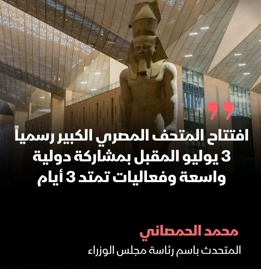 أكد المتحدث الرسمي باسم رئاسة مجلس الوزراء المستشار محمد الحمصاني، أن الاستعدادات النهائية لافتتاح المتحف المصري الكبير، تسير وفق الجدول الزمني المقرر، استعداداً للافتتاح الرسمي يوم 3 يوليو المقبل، مشيراً إلى أن أغلب الأعمال الداخلية في المتحف قد اكتملت بالكامل.