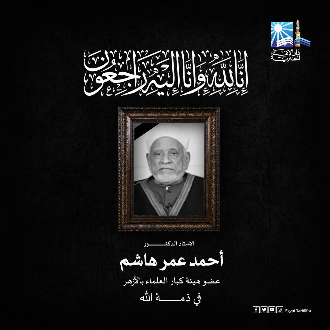 بمزيد من الرضا بقضاء الله، ينعى فضيلة أ.د نظير محمد عياد، مفتي الجمهورية، رئيس الأمانة العامة لدور وهيئات الإفتاء في العالم، فضيلة العالم الكبير، والمحدث الجليل، الأستاذ الدكتور، أحمد عمر هاشم، رئيس جامعة الأزهر الأسبق، عضو هيئة كبار العلماء بالأزهر الشريف، وأحد أعلام الحديث والدعوة في العالم العربي والإسلامي.