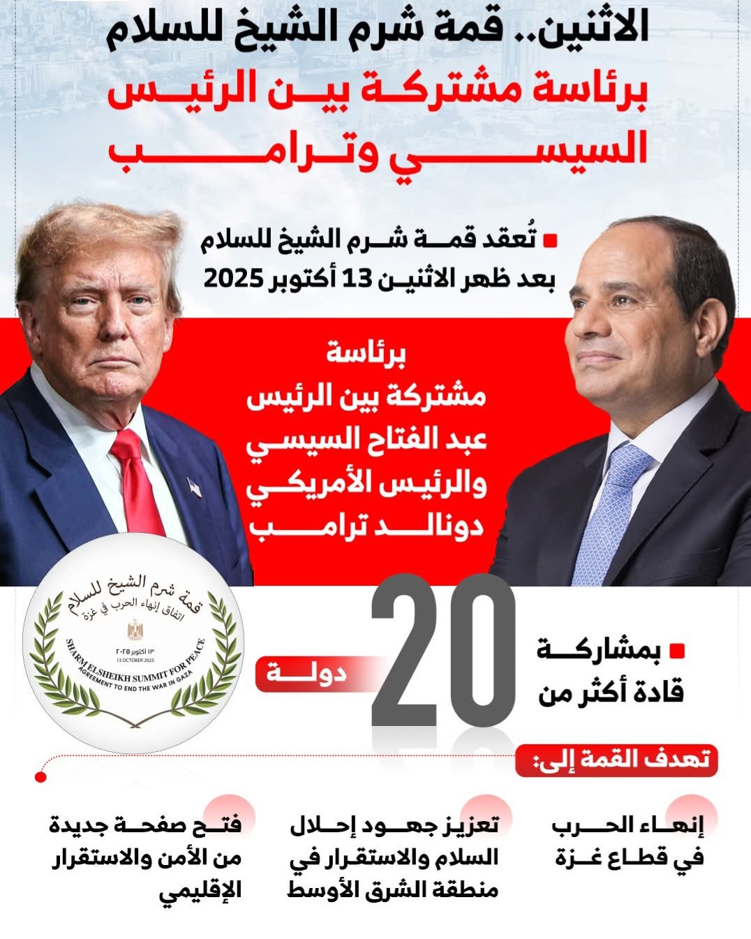 تُعقد قمة دولية تحت عنوان “قمة شرم الشيخ للسلام” بمدينة شرم الشيخ، بعد ظهر يوم الإثنين الموافق ١٣ أكتوبر ٢٠٢٥، برئاسة مشتركة بين السيد الرئيس/ عبد الفتاح السيسي والرئيس الأمريكي / دونالد ترامب، وبمشاركة قادة أكثر من عشرين دولة.