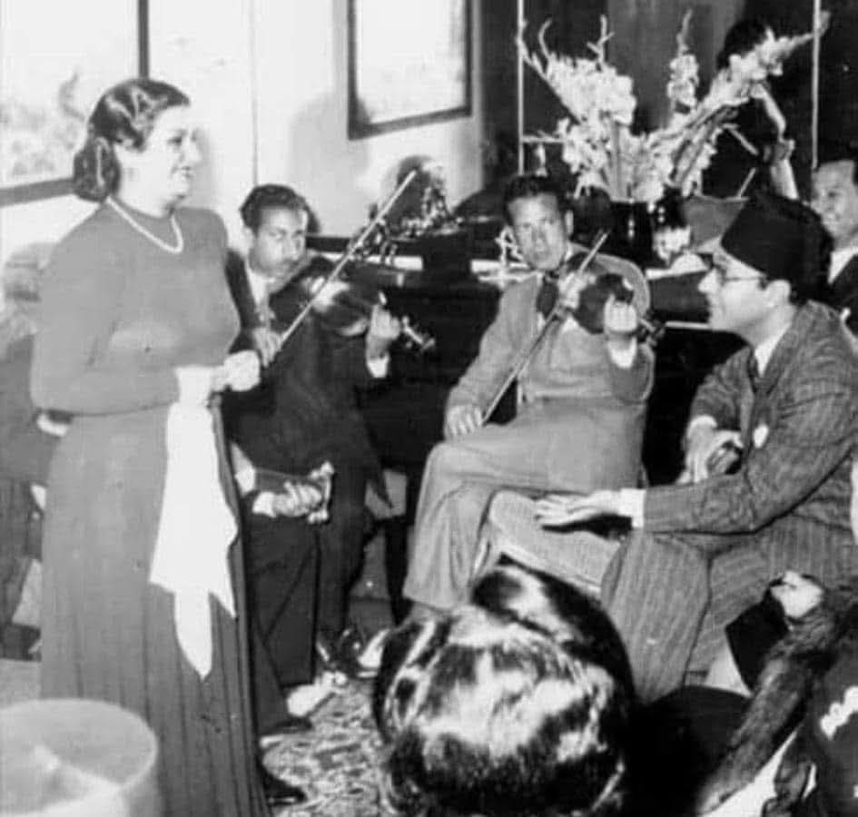 صورة نادرة تعود إلى عام 1947، يظهر موسيقار الأجيال محمد عبدالوهاب وهو يستضيف كوكب الشرق أم كلثوم في منزله بالهرم، في إحدى السهرات الفنية التي لا تُنسى.