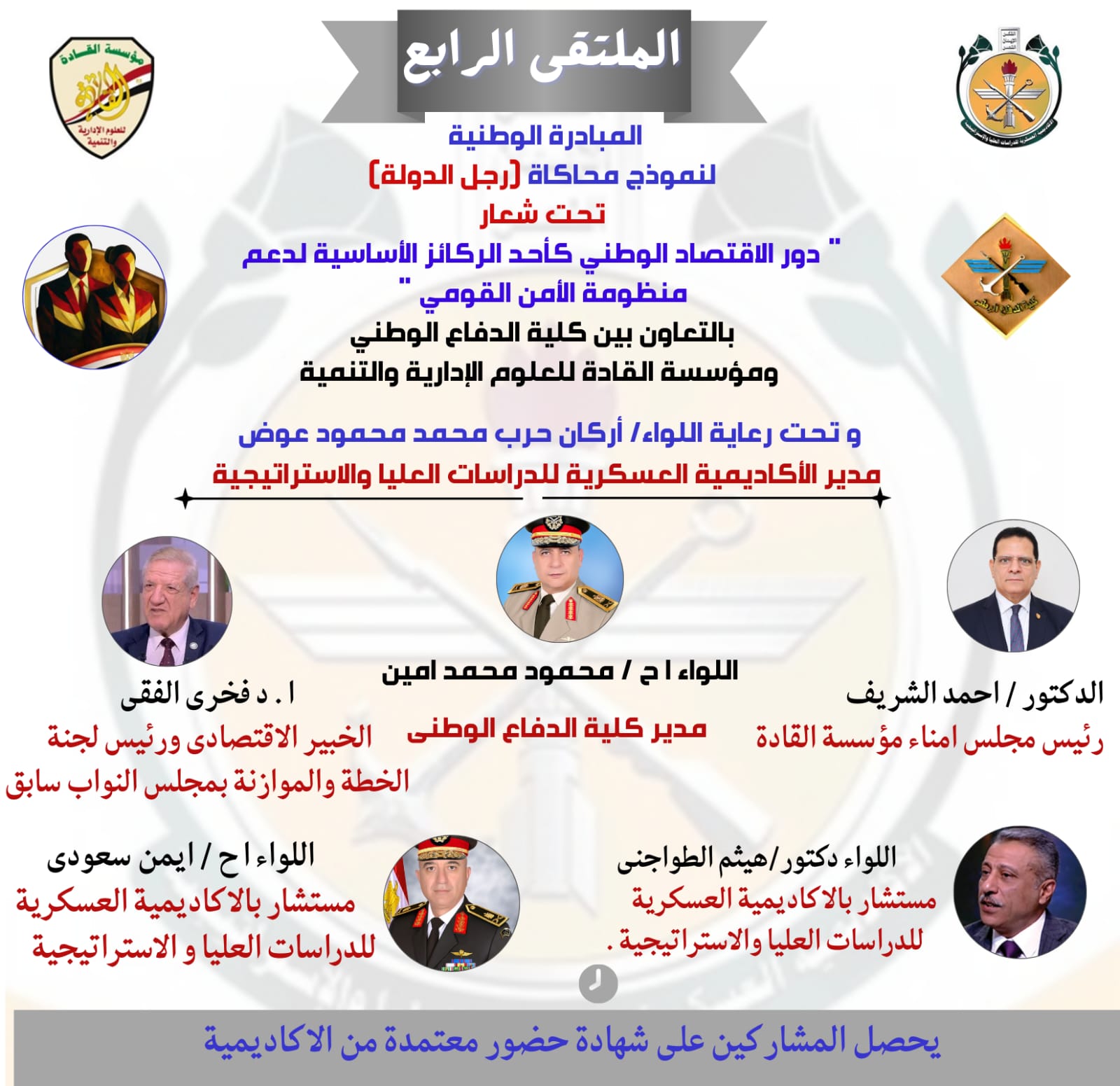 تحت رعاية اللواء أركان حرب محمد محمود عوض مدير الأكاديمية العسكرية للدراسات العليا والاستراتيجية.. والسيد اللواء أركان حرب محمود محمد أمين مدير كلية الدفاع الوطني. و الدكتور/ احمد الشريف رئيس مجلس امناء مؤسسة القادة للعلوم الادارية و التنمية