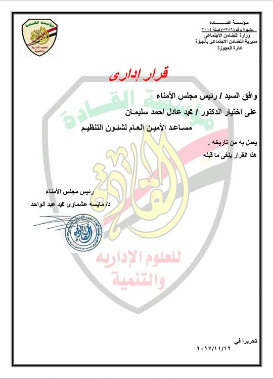 في ظل تصعيد الكوادر الشبابية المميزة قررت مؤسسة (القادة ) للعلوم الإدارية والتنمية اختيار الدكتور محمد عادل أحمد سليمان مساعداً للامين العام لشؤون التنظيم بالمؤسسة .